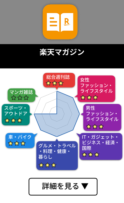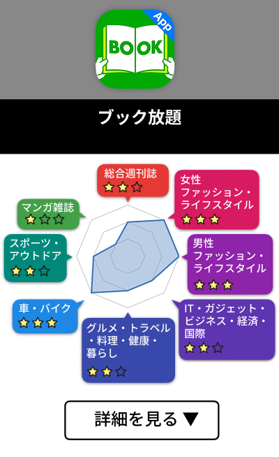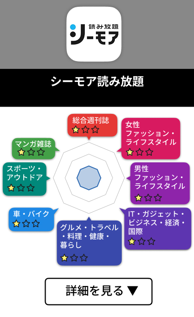 雑誌はファッション・ライフスタイル、車・バイク雑誌など主要ジャンルが豊富で、月額料金が安い割に充実しています。